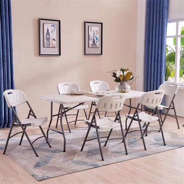 This bundle includes a white plastic folding table and six matching chairs. Ideal for indoor and outdoor gatherings, parties, and dining in any setting.