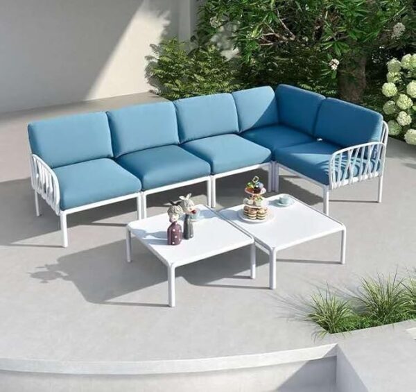 Add a splash of color to your outdoor area with this L-shaped blue patio sofa set. Designed with a strong frame, the set includes multiple seating pieces and a center table, ideal for large patios, lawns, or backyards.
