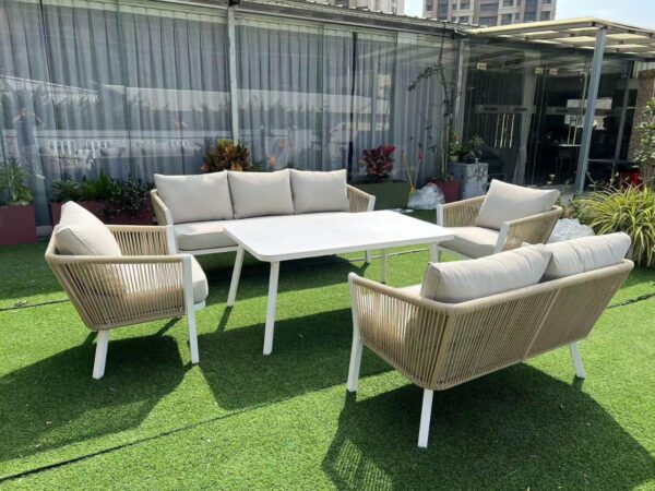 Create a serene and inviting ambiance in your outdoor space with the Coastal Rope Weave Outdoor Lounge Set. This beautifully designed collection combines the refreshing aesthetic of light-toned (beige/natural) rope weaving on the backrests and sides with robust, powder-coated white aluminium frames. The intricate weaving adds rich texture and a touch of artisanal charm, while the durable aluminium ensures exceptional stability and resistance to rust and weather, guaranteeing long-lasting beauty. Sink into luxurious comfort with the generously padded cushions in a warm beige hue, crafted from high-performance, weather-resistant fabric that resists fading and moisture, maintaining their softness and vibrant color through all seasons. The versatile set includes two comfortable 2-seater sofas and two inviting armchairs, providing ample and flexible seating arrangements for entertaining guests or enjoying peaceful moments outdoors. A sleek rectangular white coffee/dining table completes the ensemble, offering a practical and stylish surface for beverages, snacks, or d?cor. Ideal for patios, decks, or garden areas, the Coastal Rope Weave Outdoor Lounge Set is the perfect choice for those seeking to blend sophisticated design with ultimate comfort and resilience.