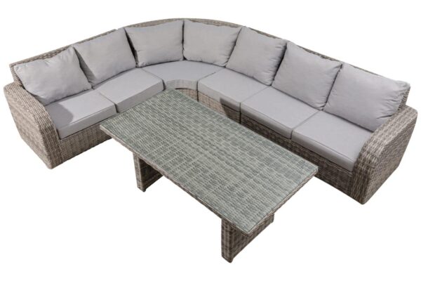 Transform your patio or garden into a luxurious outdoor haven with the Crescent Rattan Corner Sofa Set. This exquisite collection boasts a sophisticated grey woven rattan finish, meticulously hand-crafted to provide both stunning aesthetics and exceptional durability against the elements. The gentle curve of the sectional design creates an inviting and inclusive seating arrangement, perfect for intimate conversations or lively gatherings. Sink into ultimate comfort with the generously padded, light grey cushions, made from high-performance, weather-resistant fabric that ensures lasting vibrancy, softness, and easy maintenance. The expansive L-shaped sectional sofa offers abundant seating for multiple guests, making it ideal for large families or frequent entertainers. A coordinating rectangular coffee/dining table, featuring a tempered glass top over a matching woven rattan base, completes the ensemble, providing a chic and practical surface. The Crescent Rattan Corner Sofa Set is the quintessential choice for maximizing seating and style in your outdoor living area, promising years of comfort and enjoyment.