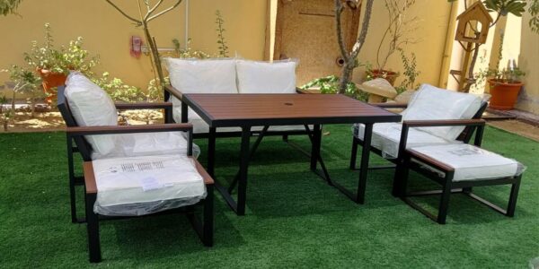 Elevate your outdoor dining and lounging experience with the Ebony Wood-Effect Outdoor Dining Set. This stylish collection combines robust, powder-coated black frames with elegant wood-effect accents on the armrests and table top, creating a sophisticated contrast that complements various outdoor aesthetics. The durable frames are designed to withstand diverse weather conditions, ensuring long-lasting enjoyment and minimal maintenance. Comfort is paramount with generously padded, pristine white cushions, made from high-performance, weather-resistant fabric that resists fading and moisture, maintaining their softness and vibrant appearance through seasons. The versatile set includes a comfortable 2-seater sofa and two inviting armchairs, providing ample seating. The centrepiece is a spacious dining table with a slatted wood-effect surface, perfect for al fresco meals, drinks, or gathering with friends and family. Ideal for patios, decks, or garden areas, the Ebony Wood-Effect Outdoor Dining Set offers a harmonious blend of contemporary design, natural warmth, and enduring comfort.