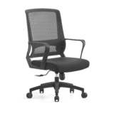 A sleek black executive chair with swivel function, armrests, and wheels, offering everyday comfort and style.