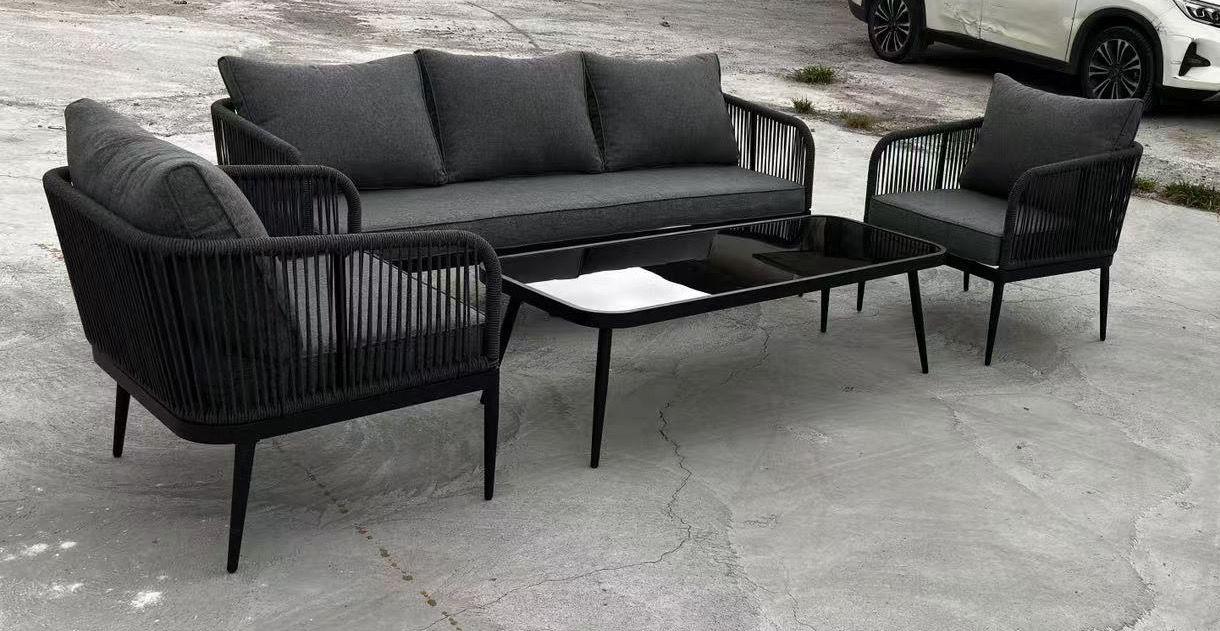 Make a sleek statement with the Midnight Rope Weave Lounge Set, featuring sophisticated dark grey rope weaving, matching frames, and plush charcoal cushions for an elegantly modern outdoor retreat.