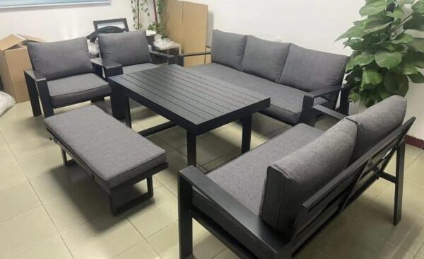 Transform your outdoor living area into a versatile and stylish dining and lounge space with the Onyx Modulo Comfort Outdoor Dining Set. This contemporary collection features sturdy, powder-coated dark grey aluminium frames, ensuring exceptional durability and resistance to rust and all weather conditions. The modular design allows for flexible arrangements, adapting to various outdoor layouts and preferences, making it ideal for both intimate gatherings and larger entertaining. Sink into ultimate comfort with the generously thick, inviting dark grey cushions, crafted from high-performance, weather-resistant fabric that offers both luxurious softness and easy maintenance. The set includes a spacious 3-seater sofa, a comfortable armchair, and a practical bench, providing diverse seating options. A sleek rectangular coffee/dining table with a slatted dark grey top completes the ensemble, providing a functional and stylish surface for beverages, meals, or gatherings. The Onyx Modulo Comfort Outdoor Dining Set is an ideal choice for those seeking a highly customizable, comfortable, and undeniably chic solution for their outdoor space.