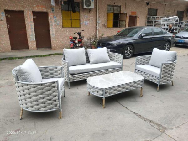 The Serenity Outdoor Sofa Set features delicate light grey rope weaving, sleek frames, and a sophisticated marble-effect table top, creating a tranquil and modern outdoor lounge space.