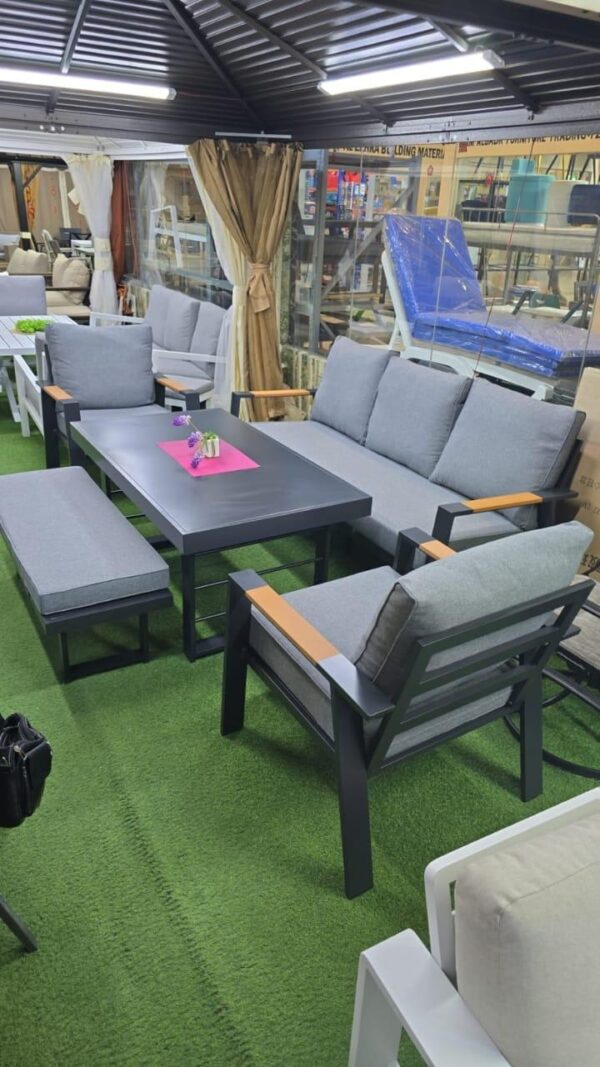 Elevate your outdoor space with the Soho Anthracite Outdoor Dining & Lounge Set, a meticulously designed collection that blends contemporary aesthetics with practical functionality. This comprehensive set features sturdy, powder-coated dark grey/anthracite aluminium frames, providing exceptional durability and resistance to the elements. Complementing these frames are sophisticated light wood-effect accents on the armrests, adding a touch of natural warmth and elegance. Comfort is paramount with plush, light grey weather-resistant cushions that offer inviting softness for prolonged relaxation. This versatile set includes a comfortable 3-seater sofa, two inviting armchairs, and a practical bench, providing ample seating for any gathering. The centrepiece is a generous dining table with a slatted dark grey top, perfect for al fresco meals, drinks, or gathering with friends and family. Designed for both lounging and dining, the Soho Anthracite set is an ideal choice for creating a stylish and functional outdoor haven that will endure for years to come.
