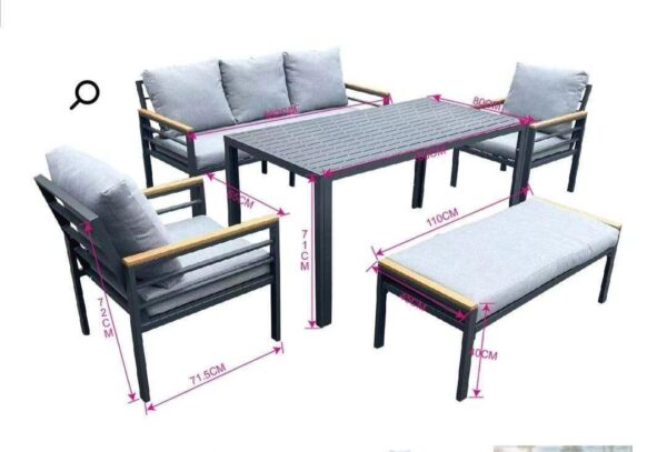The Urban Slate Outdoor Set combines robust dark grey aluminium frames with warm wood-effect accents and light grey cushions, offering a versatile and modern solution for both lounging and dining outdoors.