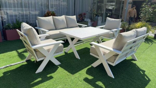 Transform your outdoor area into a stylish and inviting retreat with the X-Leg Contemporary Outdoor Sofa Set. This eye-catching collection is defined by its unique and robust white X-shaped bases on all seating pieces and the table, offering a distinctive modern aesthetic that sets it apart. Crafted from durable materials (likely powder-coated aluminium or a similar weather-resistant compound), the frames ensure longevity and resistance to outdoor elements. Sink into ultimate comfort with the generously padded cushions, upholstered in a warm beige, high-performance fabric that is both weather and fade-resistant, ensuring enduring beauty and softness. The set includes a spacious 3-seater sofa, two comfortable armchairs, and a versatile bench, providing ample seating for entertaining guests or simply relaxing outdoors. A coordinating rectangular dining/coffee table with a slatted white top completes the ensemble, offering a functional and stylish surface. The X-Leg Contemporary Outdoor Sofa Set is an ideal choice for those seeking to infuse their patio, garden, or deck with architectural flair and luxurious comfort.